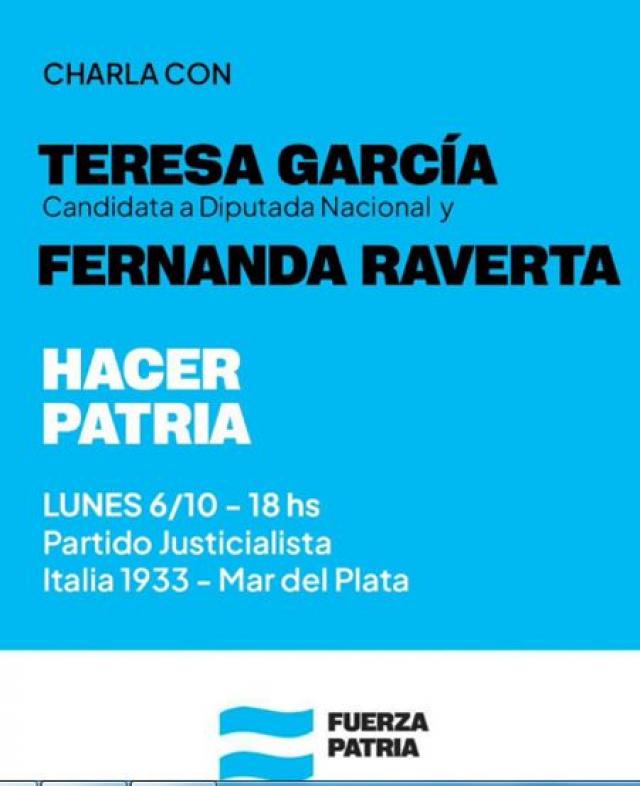 Este lunes 6 de octubre a las 18 horas, en la sede del Partido Justicialista (Italia 1933), se realizará una charla abierta en el marco de la campaña de Fuerza Patria rumbo a las elecciones de octubre.