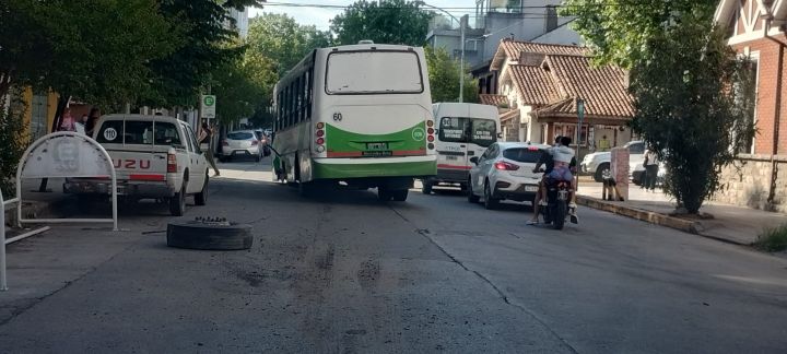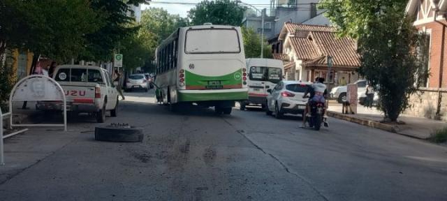 (Foto: El colectivo perdió una goma -este viernes en la tarde-, en la calle 25 de Mayo casi Salta)