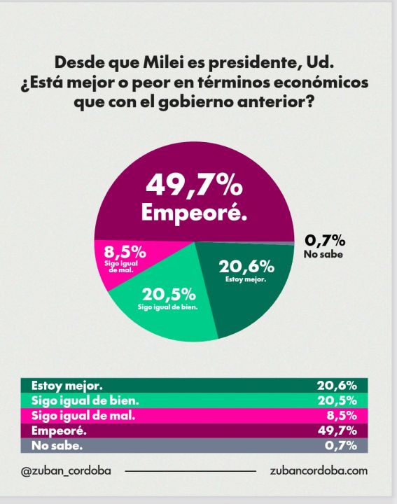 La percepción sobre la situación económica personal se consolidó como uno de los datos más relevantes de un reciente estudio de opinión. Según el relevamiento de Zuban Córdoba & Asociados correspondiente a diciembre, el 49,7% de las personas consultadas afirmó que su situación económica empeoró desde la asunción de Javier Milei como presidente. En contraste, solo el 20,6% aseguró estar mejor, mientras que el 20,5% sostuvo que continúa igual de bien y el 8,5% que sigue igual de mal. Un 0,7% no supo responder.