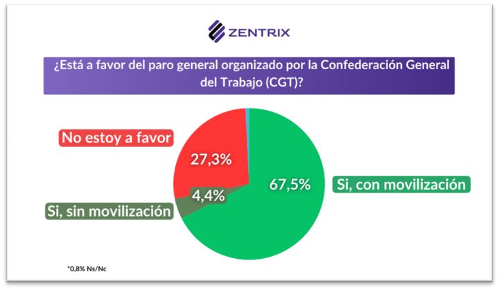 Un relevamiento nacional realizado por Zentrix durante las últimas 24 horas muestra que el 71,9% de los consultados está a favor del paro general convocado por la Confederación General del Trabajo (CGT), en un contexto donde el respaldo a la reforma laboral impulsada por el Gobierno nacional cayó casi siete puntos en los últimos tres meses.