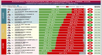 La tabla está liderada por Nayib Bukele (El Salvador), con 70,1% de imagen positiva; Claudia Sheinbaum (México), 69,8%; Rodrigo Chaves (Costa Rica), 59,5%; Luis Abinader (República Dominicana), 57,3%; Rodrigo Paz (Bolivia), 52,9%; y Daniel Ortega (Nicaragua), 51,8%.